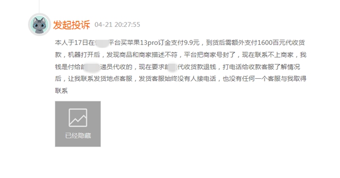 黑貓投訴平臺顯示,代收貨款相關(guān)投訴并不鮮見。有網(wǎng)友稱,在某電商平臺買蘋果手機支付訂金9.9元,到貨后額外支付1600元代收貨款,機器打開后,發(fā)現(xiàn)商品和商家描述不符,電商平臺把商家封了,快遞平臺讓聯(lián)系發(fā)貨地點客服,可根本聯(lián)系不上商家。