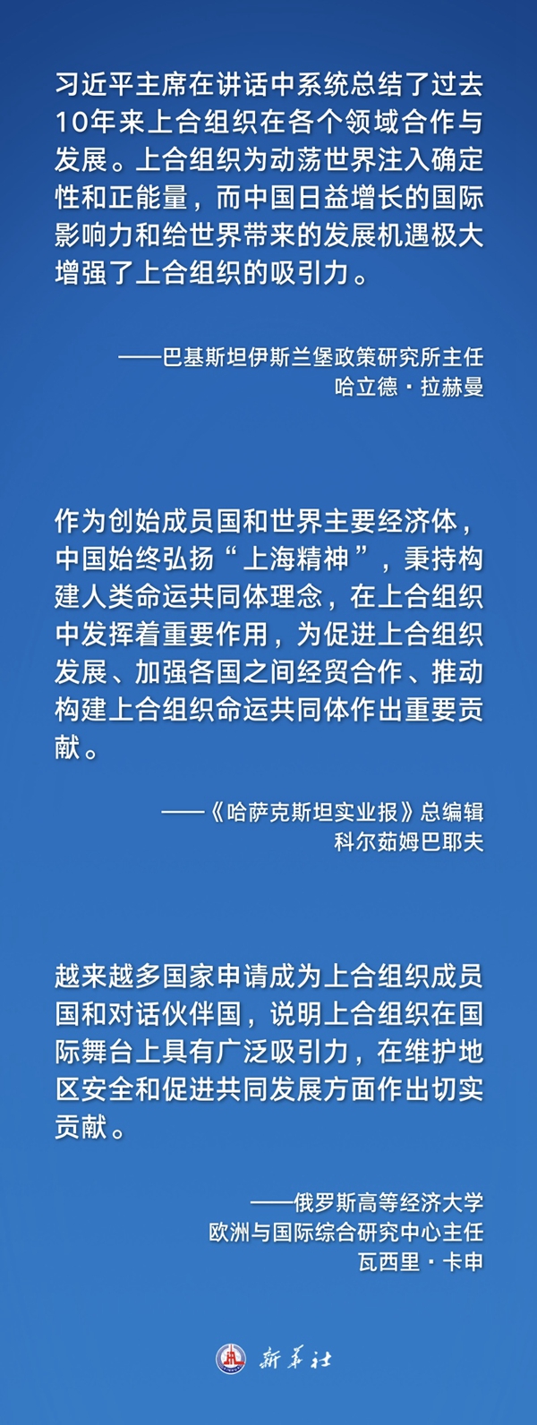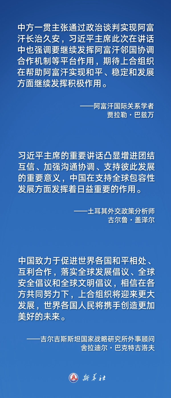 國(guó)際社會(huì)普遍認(rèn)為,習(xí)近平主席的重要講話(huà)將促進(jìn)上合組織成員國(guó)增進(jìn)團(tuán)結(jié)互信、維護(hù)地區(qū)和平、聚焦務(wù)實(shí)合作、加強(qiáng)交流互鑒、完善全球治理,推動(dòng)上合組織不斷發(fā)展壯大,為維護(hù)世界和平與發(fā)展注入更多確定性和正能量。