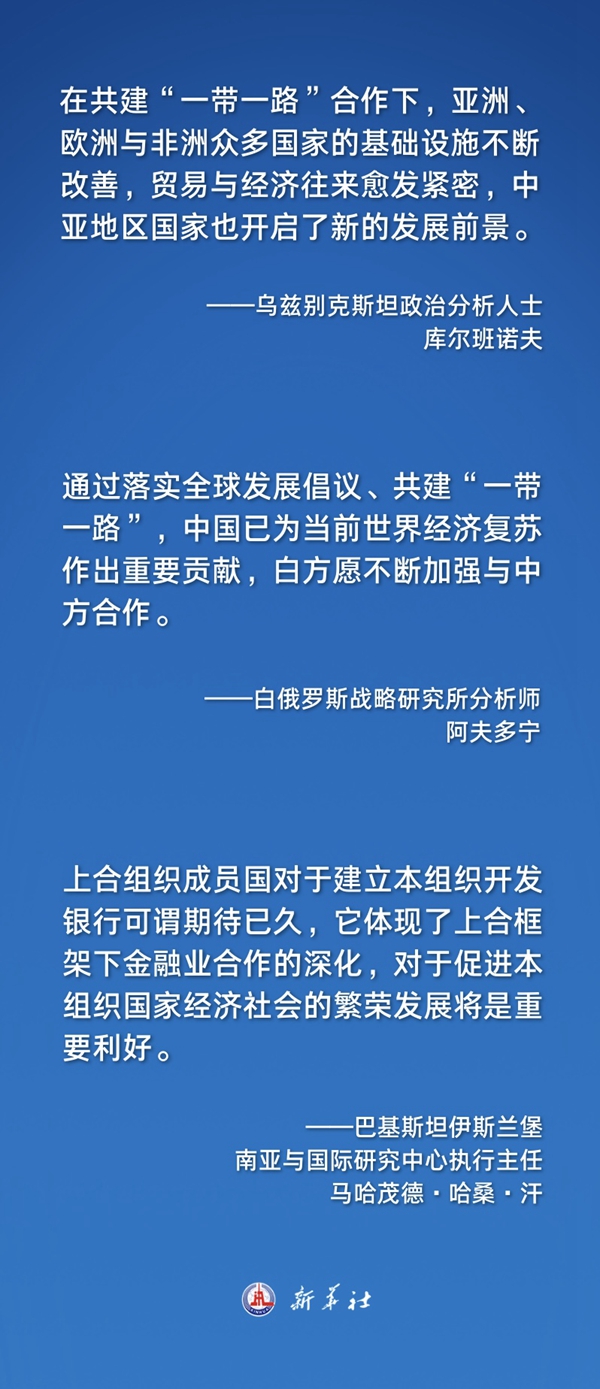 對(duì)于習(xí)近平主席提出的“擴(kuò)大本組織國(guó)家本幣結(jié)算份額”“建立本組織開(kāi)發(fā)銀行”等建議,巴基斯坦伊斯蘭堡南亞與國(guó)際研究中心執(zhí)行主任馬哈茂德·哈?!ず拐f(shuō),上合組織成員國(guó)對(duì)于建立本組織開(kāi)發(fā)銀行可謂期待已久,它體現(xiàn)了上合框架下金融業(yè)合作的深化,對(duì)于促進(jìn)本組織國(guó)家經(jīng)濟(jì)社會(huì)的繁榮發(fā)展將是重要利好。