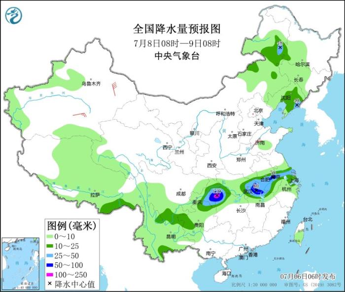 7月8日08時至9日08時,內蒙古東北部、黑龍江西南部、遼寧中東部、蘇皖南部、上海、湖北東部和西南部、江西北部、湖南西北部、重慶東南部、貴州北部等地部分地區(qū)有中到大雨,局地有暴雨或大暴雨(100~120毫米)。新疆南疆盆地等地的部分地區(qū)有4~6級風。