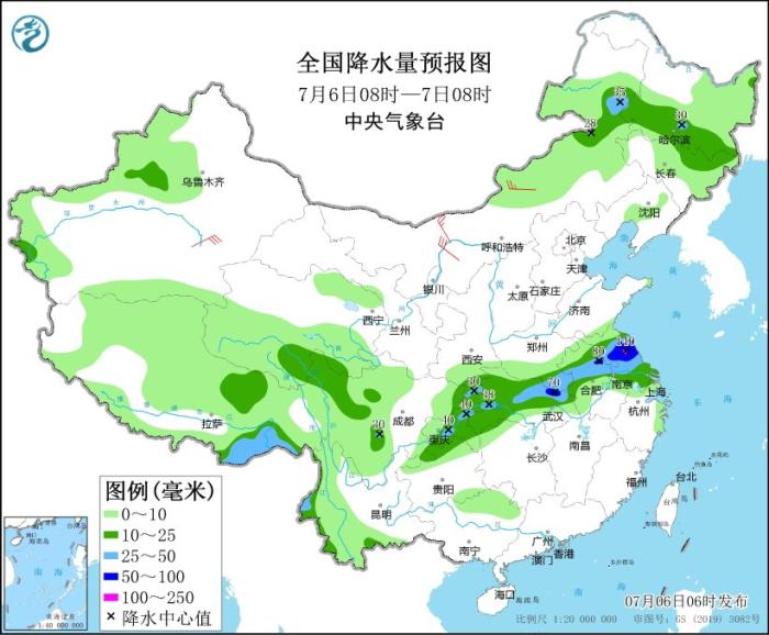 全國降水量預報圖(7月6日08時-7日08時)。圖片來源:中央氣象臺網站