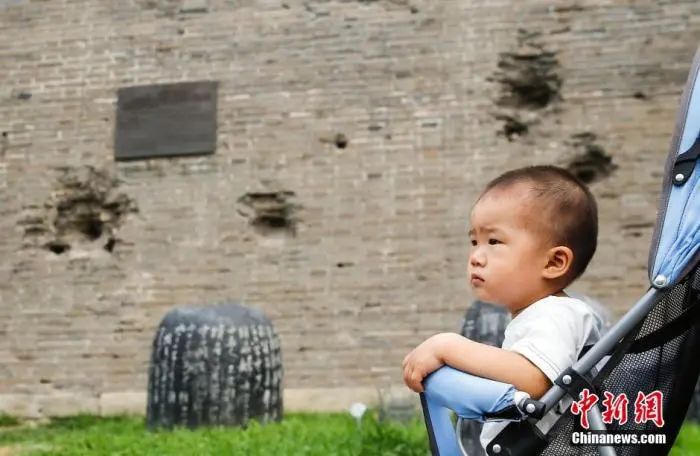 資料圖:“全民族抗戰(zhàn)爆發(fā)77周年”紀念日,一名嬰兒在盧溝橋宛平城外的彈坑前留影。中新社發(fā) 張浩 攝