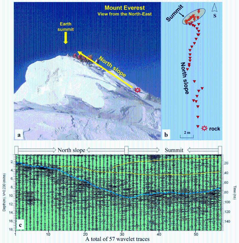 “此次測量采用雷達(dá)剖面測量方法,科考隊員利用1000兆赫茲一體化冰雪測厚雷達(dá),沿珠峰頂部裸露基巖處開始測量,逐步測量到珠峰頂部?!敝榉宸屙斃走_(dá)測厚項目負(fù)責(zé)人、中科院青藏高原所研究員楊威介紹,相比過去頂部單點雷達(dá)測量方法,該剖面測量方法可以保證積雪—基巖雷達(dá)反射界面呈現(xiàn)漸變趨勢,易于后期數(shù)據(jù)正確解讀。