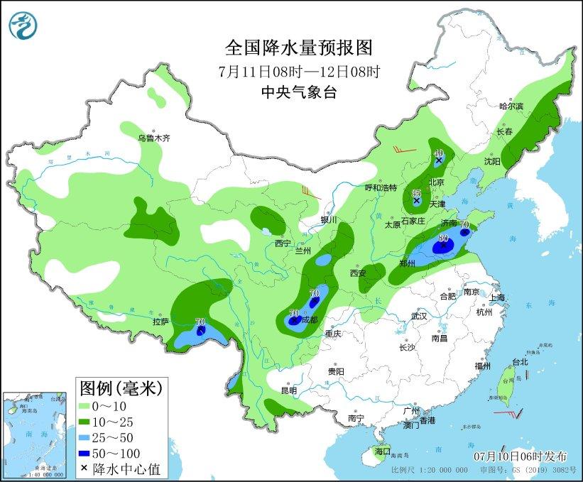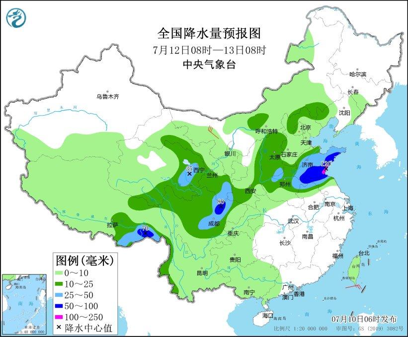 7月11日08時(shí)至12日08時(shí),內(nèi)蒙古東南部、東北地區(qū)東部、西藏東部、青海北部、西北地區(qū)東部、華北東部、黃淮大部、四川盆地東部、云南西部等地部分地區(qū)有中到大雨,其中,山東中南部、四川盆地西部、西藏東南部等地部分地區(qū)有暴雨(50~80毫米)。內(nèi)蒙古中西部等地部分地區(qū)有4~6級(jí)風(fēng)(見(jiàn)圖4)。