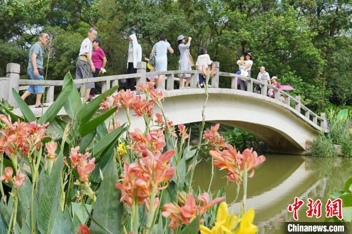 中新網(wǎng)柳州7月9日電(韋國政)7月9日,時值周末,廣西柳州市魚峰區(qū)龍?zhí)豆珗@里萬株美人蕉盛開,與各色水生花卉和時令草花一起,構(gòu)成色彩繽紛的濱水花境。游客紛至沓來,樂享周末悠閑時光。