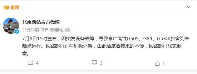 中新網(wǎng)7月9日電 據(jù)北京西站官方微博消息,7月9日15時左右,因突發(fā)設備故障,導致京廣高鐵G505、G89、G53次旅客列車晚點運行。鐵路部門正在積極處置,由此給旅客帶來的不便,鐵路部門深表歉意。