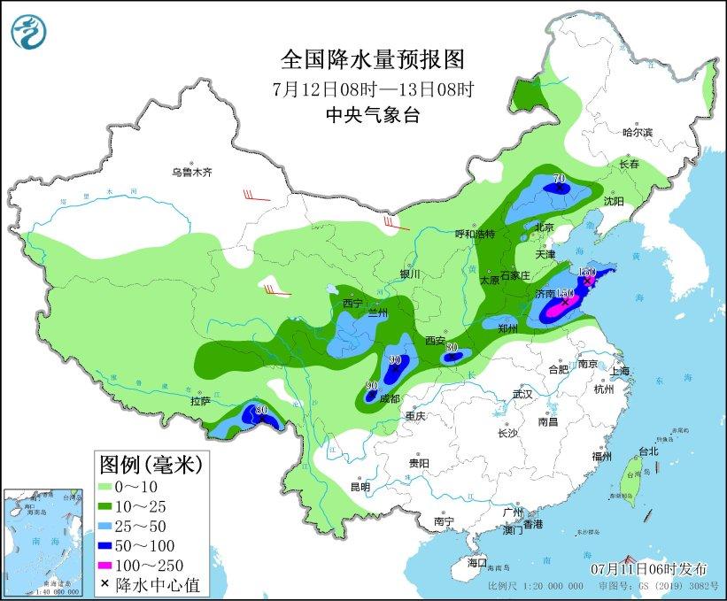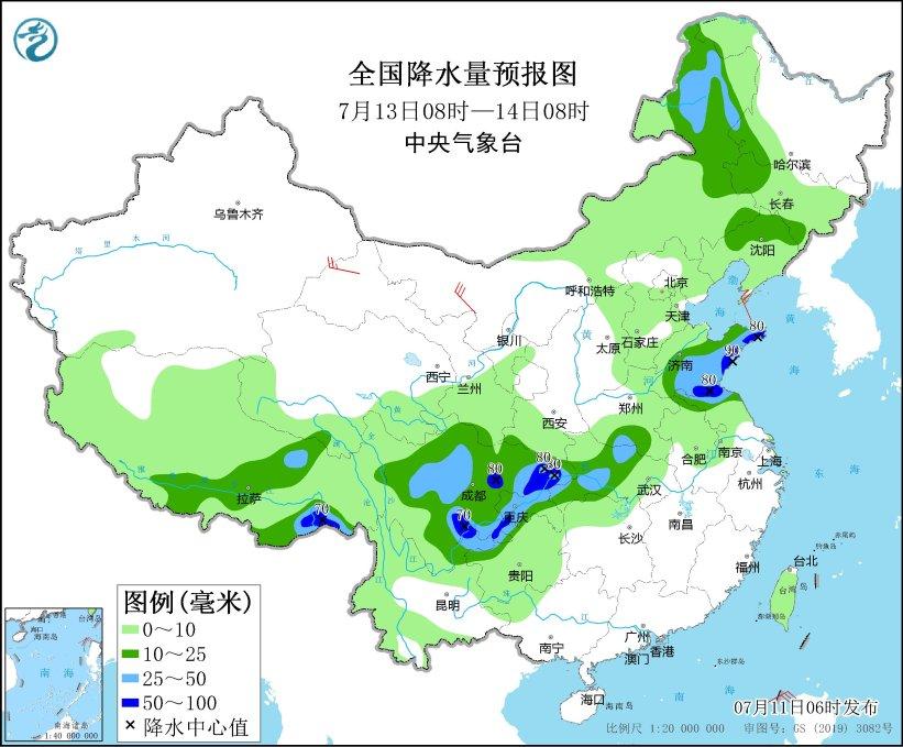 7月11日至14日,四川盆地、西北地區(qū)東部、華北、黃淮、江淮、江漢等地有較強(qiáng)降雨過程,其中,四川盆地、甘肅南部、陜南部、河南、山東、蘇皖北部以及內(nèi)蒙古東北部、西藏東南部等地的部分地區(qū)有大到暴雨,山東中南部、江蘇北部等地部分地區(qū)有大暴雨;降雨過程伴有雷電、短時強(qiáng)降水、局地雷暴大風(fēng)等強(qiáng)對流天氣。
