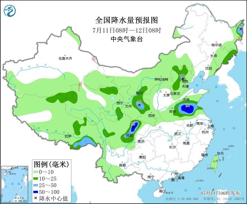 7月11日08時至12日08時,黑龍江東北部、吉林東部、河北中北部、北京、甘肅東南部、四川盆地西部、河南東部、山東南部、蘇皖北部及西藏北部和東南部、青海西部等地的部分地區(qū)有中到大雨,其中,山東南部、河南東部、安徽北部、江蘇北部、四川盆地西北部等地局地有暴雨(50~90毫米)。新疆東部、青海西部等地部分地區(qū)有5~6級風(fēng)(見圖3)。