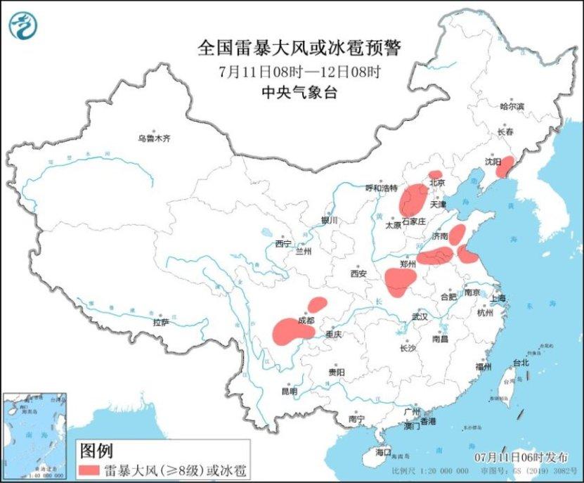 預(yù)計7月11日08時至12日08時,遼寧東部、山西北部、河北中部、北京北部和西南部、山東中南部、河南東部和西部、安徽北部、江蘇北部、湖北北部、四川東部和中南部等地的部分地區(qū)將有8-10級雷暴大風(fēng)或冰雹天氣(見圖2);內(nèi)蒙古南部、黑龍江東北部、吉林東部、遼寧東部、青海南部、甘肅南部、寧夏中南部、陜西北部和南部、山西北部、河北中北部和西南部、北京北部和南部、山東中南部、河南、安徽北部、江蘇中北部、湖北西北部、浙江南部、四川中東部和南部、云南西部和南部等地的部分地區(qū)將有短時強(qiáng)降水天氣,小時雨量30-50毫米,局地可達(dá)60毫米以上。中央氣象臺7月11日06時繼續(xù)發(fā)布強(qiáng)對流天氣藍(lán)色預(yù)警。