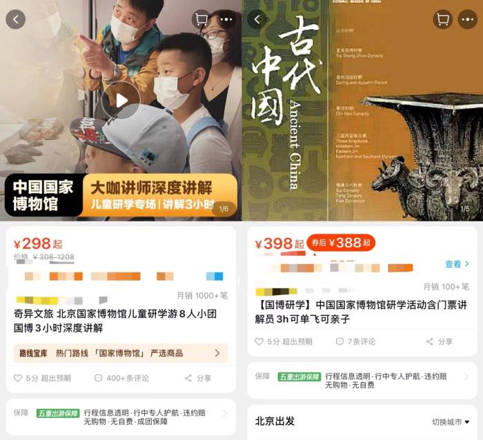中新網(wǎng)在電商平臺(tái)上發(fā)現(xiàn),一些研學(xué)機(jī)構(gòu)商家可以提供博物館講解服務(wù),價(jià)格在168-388元不等,講解時(shí)間為2-3小時(shí)。例如,國(guó)家博物館“古代中國(guó)”展的講解項(xiàng)目,某機(jī)構(gòu)按照每人388元進(jìn)行收費(fèi),講解3小時(shí),平均每小時(shí)129元,成團(tuán)人數(shù)為12人起,滿團(tuán)25人。這家機(jī)構(gòu)承諾提供訂票服務(wù),不用游客自行預(yù)約,保證順利入館。