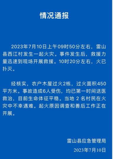中新網(wǎng)貴陽7月10日電(袁超)貴州省黔東南苗族侗族自治州雷山縣應(yīng)急管理局10日通報(bào)稱,7月10日9時(shí)50分許,雷山縣西江村發(fā)生一起火災(zāi),致6人受傷2人遇難。