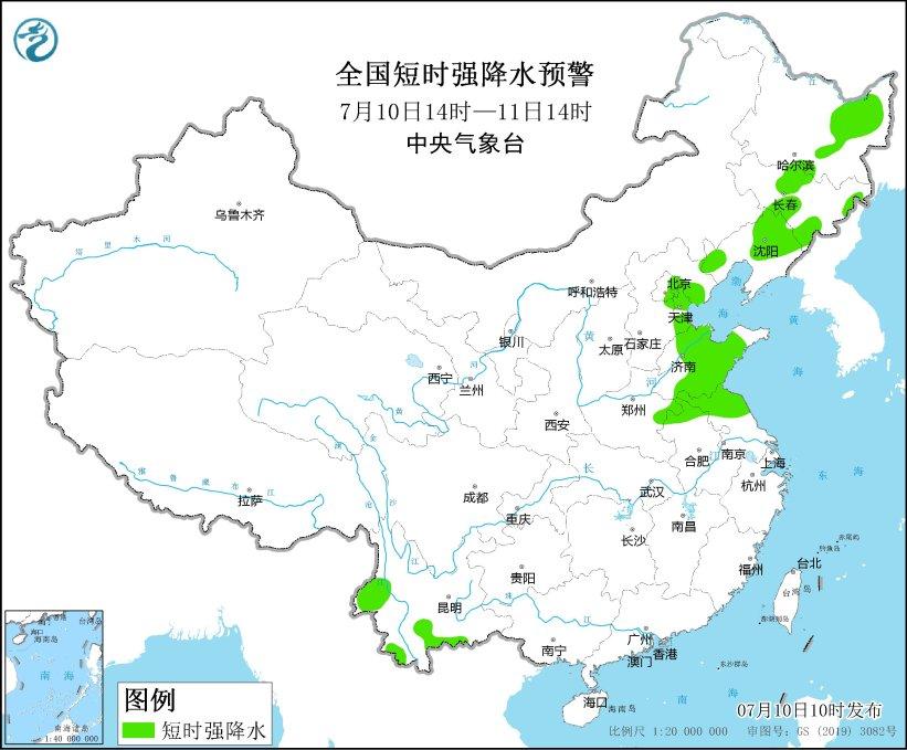 中新網(wǎng)7月10日電 據(jù)中央氣象臺網(wǎng)站消息,中央氣象臺7月10日10時繼續(xù)發(fā)布強對流天氣藍色預(yù)警:預(yù)計7月10日14時至11日14時,吉林東南部、遼寧北部和西南部、北京東南部、天津北部、山東、江蘇北部、安徽東北部等地的部分地區(qū)將有8-10級雷暴大風(fēng)或冰雹天氣;黑龍江中東部、吉林中東部、遼寧中北部和西南部、河北中部和東北部、北京東部、天津、山東、河南東部、安徽北部、江蘇北部、云南南部和西部等地的部分地區(qū)將有短時強降水天氣,小時雨量30-50毫米,局地可達60毫米以上。