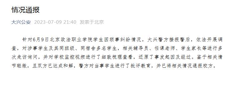 中新網(wǎng)7月10日電 據(jù)北京市公安局大興分局官方微信消息,針對6月9日北京政法職業(yè)學(xué)院學(xué)生因瑣事糾紛情況,大興警方接報(bào)警后,依法開展調(diào)查,對涉事學(xué)生及其同班級、同宿舍多名學(xué)生,相關(guān)輔導(dǎo)員、任課老師、學(xué)生家長等進(jìn)行多次走訪詢問,并對學(xué)校監(jiān)控視頻進(jìn)行了細(xì)致梳理查看,還原了事發(fā)起因及經(jīng)過。