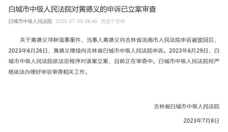 中新網(wǎng)7月8日電 據(jù)白城市中級人民法院微信公眾號8日消息,關(guān)于黃德義尋釁滋事案件,當(dāng)事人黃德義向吉林省洮南市人民法院申訴被駁回后,2023年6月26日,黃德義繼續(xù)向吉林省白城市中級人民法院申訴。2023年6月29日,白城市中級人民法院依法定程序?qū)υ摪噶?,目前正在審查中。白城市中級人民法院將?yán)格依法辦理好申訴審查相關(guān)工作。