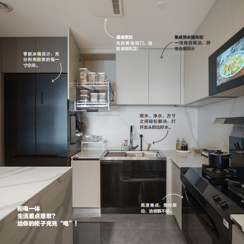 在智能廚房中,主要展現(xiàn)了主人下廚零負擔的生活動線:備菜-收納-下廚-清潔,通過智能交互的思考,讓廚房燈,涼霸、油煙機,烤箱同步聯(lián)動,打造極具幸福感的廚房。同時還有許多貼心細節(jié),如水槽側(cè)邊巧妙設計了可干濕分離的隱藏式垃圾桶,保持廚房空間整潔美觀,又方便快捷。還有只需碰一下,就能自動下降的電動拉籃,方便拿取調(diào)味料。