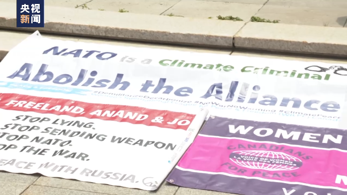 抗議者高舉的標(biāo)語(yǔ)牌上寫有“反對(duì)北約維爾紐斯峰會(huì)”“解散北約”“加拿大退出北約”等字樣。活動(dòng)組織者表示,他們抗議在立陶宛維爾紐斯召開(kāi)的北約峰會(huì),因?yàn)樵摲鍟?huì)討論的不是和平談判與結(jié)束沖突,而是要繼續(xù)擴(kuò)大北約,繼續(xù)向?yàn)蹩颂m提供更多的軍火。