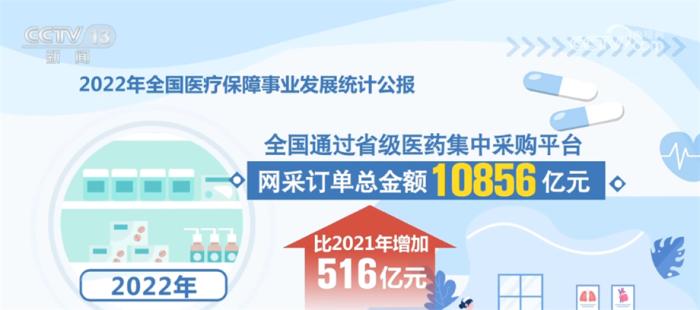 在藥品和耗材集采方面,2022年,第七批國(guó)家組織藥品集中帶量采購(gòu)涉及61個(gè)品種,平均降價(jià)48%。國(guó)家組織骨科脊柱類高值醫(yī)用耗材集采納入5種脊柱類骨科耗材,平均降幅84%。根據(jù)公報(bào),2022年,全國(guó)通過(guò)省級(jí)醫(yī)藥集中采購(gòu)平臺(tái)網(wǎng)采訂單總金額10856億元,比2021年增加516億元。其中,西藥(化學(xué)藥及生物制品)8810億元,中成藥2046億元,分別比2021年增加495億元和21億元。群眾用上了更多質(zhì)優(yōu)價(jià)宜的藥品和耗材。