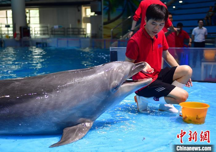 飼養(yǎng)員正在喂海豚吃魷魚(yú)果凍?!∮菘〗?攝