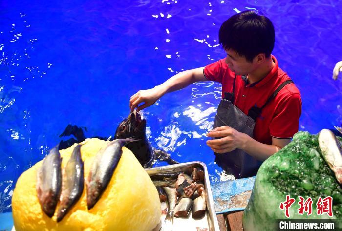 飼養(yǎng)員正在喂海豹吃冰鎮(zhèn)小魚(yú)?!∮菘〗堋z