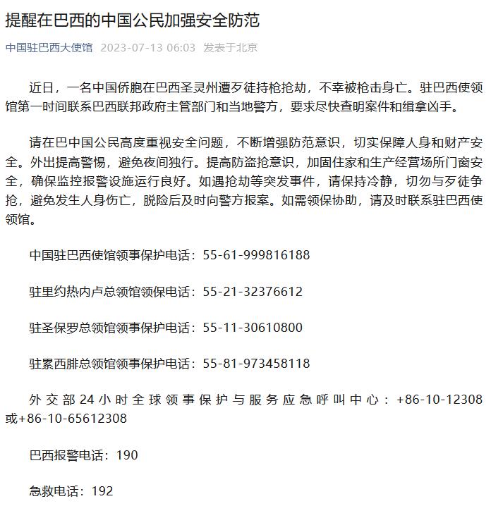 中新網(wǎng)7月13日電 據(jù)中國駐巴西大使館微信公眾號13日消息,近日,一名中國僑胞在巴西圣靈州遭歹徒持槍搶劫,不幸被槍擊身亡。駐巴西使領館第一時間聯(lián)系巴西聯(lián)邦政府主管部門和當?shù)鼐?,要求盡快查明案件和緝拿兇手。