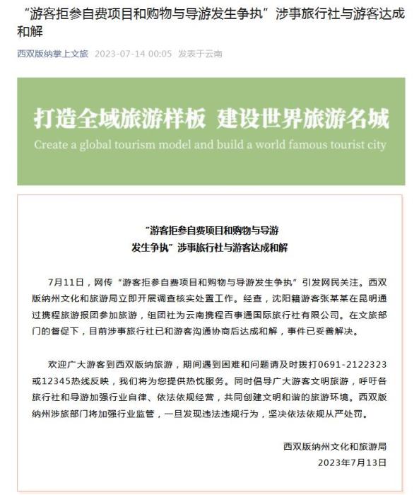 經(jīng)查,沈陽籍游客張某某在昆明通過攜程旅游報(bào)團(tuán)參加旅游,組團(tuán)社為云南攜程百事通國際旅行社有限公司。在文旅部門的督促下,目前涉事旅行社已和游客溝通協(xié)商后達(dá)成和解,事件已妥善解決。