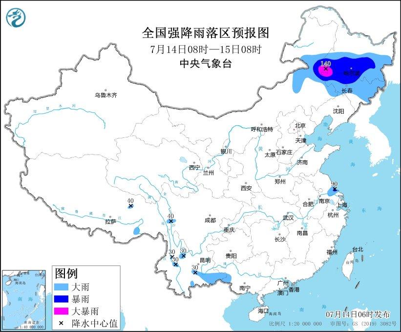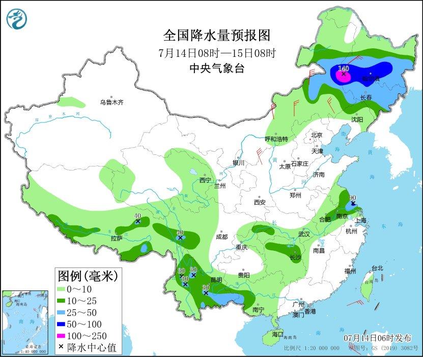 7月14日08時(shí)至15日08時(shí),內(nèi)蒙古東部、東北地區(qū)大部、江蘇中南部、安徽南部、重慶北部、廣西西南部、云南大部、西藏東北部和南部等地部分地區(qū)有中到大雨,其中,內(nèi)蒙古東北部、黑龍江南部、吉林中西部等地部分地區(qū)有暴雨或大暴雨(100~140毫米)。內(nèi)蒙古中東部等地部分地區(qū)有4~6級(jí)風(fēng)(見(jiàn)圖4)。