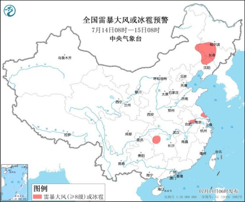 預(yù)計(jì),7月14日08時(shí)至15日08時(shí),內(nèi)蒙古東北部、黑龍江南部、吉林、遼寧北部、江蘇南部、云南西北部和南部等地部分地區(qū)有大到暴雨,其中,內(nèi)蒙古東北部、吉林西部等地部分地區(qū)有大暴雨(100~140毫米)。上述部分地區(qū)伴有短時(shí)強(qiáng)降水(最大小時(shí)降雨量30~50毫米,局地可超過(guò)60毫米),局地有雷暴大風(fēng)等強(qiáng)對(duì)流天氣(見(jiàn)圖1)。內(nèi)蒙古東南部、黑龍江西南部、吉林中西部、遼寧北部、安徽中部、江蘇中部、湖南西北部等地的部分地區(qū)將有8-10級(jí)雷暴大風(fēng)或冰雹天氣(見(jiàn)圖2);內(nèi)蒙古東南部、黑龍江西南部、吉林中西部、遼寧北部、安徽中南部、江蘇中部、湖北東部和西南部、湖南中北部、重慶東南部、云南中西部和東南部、廣西西部、臺(tái)灣島東部等地的部分地區(qū)將有短時(shí)強(qiáng)降水天氣,小時(shí)雨量30-50毫米,局地可達(dá)60毫米以上。中央氣象臺(tái)7月14日06時(shí)繼續(xù)發(fā)布暴雨、強(qiáng)對(duì)流天氣藍(lán)色預(yù)警。