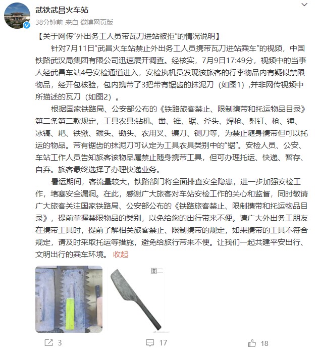 中新網(wǎng)7月13日電 據(jù)武昌火車站官方微博消息,針對(duì)7月11日“武昌火車站禁止外出務(wù)工人員攜帶瓦刀進(jìn)站乘車”的視頻,中國(guó)鐵路武漢局集團(tuán)有限公司迅速展開調(diào)查。經(jīng)核實(shí),7月9日17:49分,視頻中的當(dāng)事人經(jīng)武昌車站4號(hào)安檢通道進(jìn)入,安檢執(zhí)機(jī)員發(fā)現(xiàn)該旅客的行李物品內(nèi)有疑似禁限物品,經(jīng)開包核驗(yàn),包內(nèi)攜帶了3把帶有鋸齒的抹泥刀(如圖1),并非網(wǎng)傳視頻中所描述的瓦刀(如圖2)。