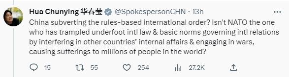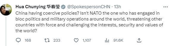 針對北約的負面涉華表態(tài),華春瑩寫道,“中國有脅迫性政策?難道不是北約在全世界搞集團政治和軍事行動,用武力威脅別國,挑戰(zhàn)全球利益、安全和價值觀嗎?”
