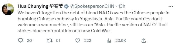華春瑩表示,“我們沒有忘記北約轟炸中國駐南聯(lián)盟大使館,沒有忘記北約欠下中國人民的血債。亞太國家不歡迎戰(zhàn)爭機器,更不歡迎挑起集團對抗或新冷戰(zhàn)的‘亞太版北約’”。