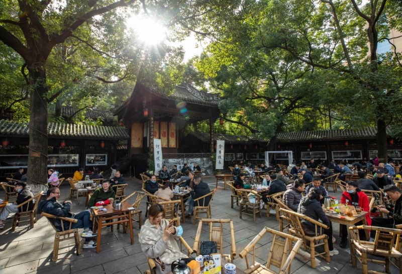 人們?cè)诔啥继爬锎蟠人聝?nèi)的茶社喝茶、休閑,不遠(yuǎn)處高樓林立