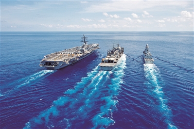 7月3日,美海軍“艾森豪威爾”號(hào)航母與意大利海軍“弗吉尼奧·法?!碧?hào)護(hù)衛(wèi)艦(右一)在大西洋進(jìn)行綜合補(bǔ)給訓(xùn)練。