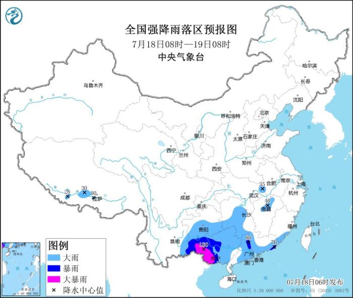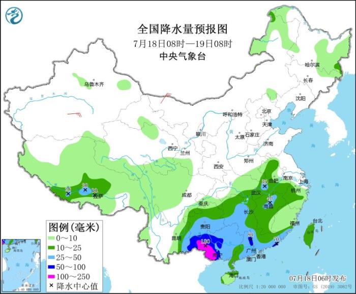 7月18日08時至19日08時,廣東大部、廣西、福建東南部、湖南中南部、貴州南部、云南東南部等地的部分地區(qū)有大到暴雨,其中,廣西西部、云南東南部等地的部分地區(qū)有大暴雨(100~180毫米);江西中北部、湖北東部、安徽西部等地的部分地區(qū)有分散性大雨或暴雨(見圖3)。內(nèi)蒙古西北部、新疆南疆盆地等地的部分地區(qū)有4~5級風(fēng);北部灣將有8~9級、陣風(fēng)10級的西南風(fēng)。