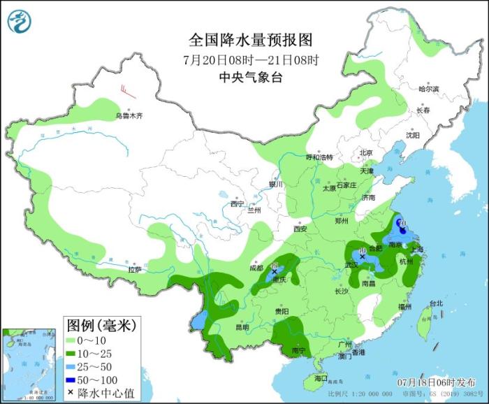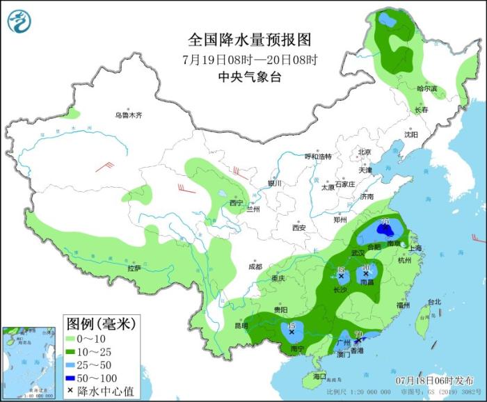 圖4 全國降水量預(yù)報圖(7月19日08時-20日08時)