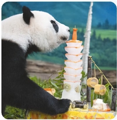 動物園為“圓仔”精心準備了造型獨特的冰雕“蛋糕”,并舉辦了生日會。不少市民一早就在大熊貓館前排起長隊,為這位“頂流明星”送上生日祝福。