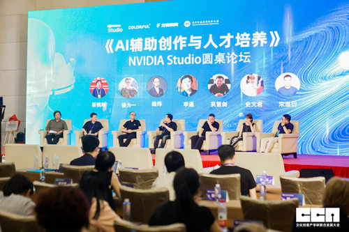 在《AI輔助創(chuàng)作與人才培養(yǎng)》 NVIDIA Studio 圓桌論壇上, NVIDIA Studio 業(yè)務拓展經(jīng)理陸燁,七彩虹整機市場經(jīng)理李健,網(wǎng)易有道校企合作總監(jiān)宋維衍,龍奇教育總經(jīng)理楊為一,天津美術(shù)學院影視與傳媒藝術(shù)學院院長李通,上海工藝美術(shù)學院院長吳慧劍,天津中德應用技術(shù)大學藝術(shù)學院院長靳鶴琳等人,分別站在企業(yè)、院校的角度,圍繞“如何利用AI工具達到降本增效”“AI輔助創(chuàng)作下創(chuàng)作者的角色轉(zhuǎn)變”“如何與時俱進,培養(yǎng)擅于利用AI輔助創(chuàng)作的人才”等主題進行了深入探討。在場觀眾也積極參與。