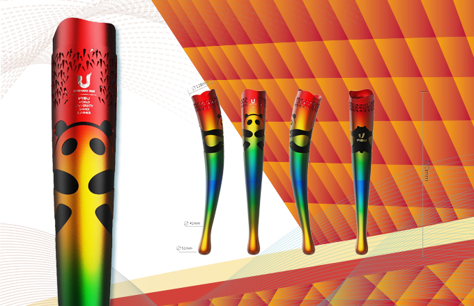 成都大運會火炬“蓉火”取成都的簡稱“蓉”,同時寓有“融合”“包容”之意?;鹁孢\用多彩漸變的大運會主視覺色塊,將朱紅、明黃、翠綠、湖藍四個漸變色整合起來,又呈現(xiàn)成都熱情、活力、時尚的多彩生活與大學(xué)生的斑斕青春。