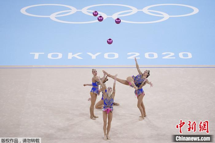 資料圖:俄羅斯體操運(yùn)動(dòng)員在2020年東京奧運(yùn)會(huì)藝術(shù)體操團(tuán)體全能預(yù)選賽中表演。