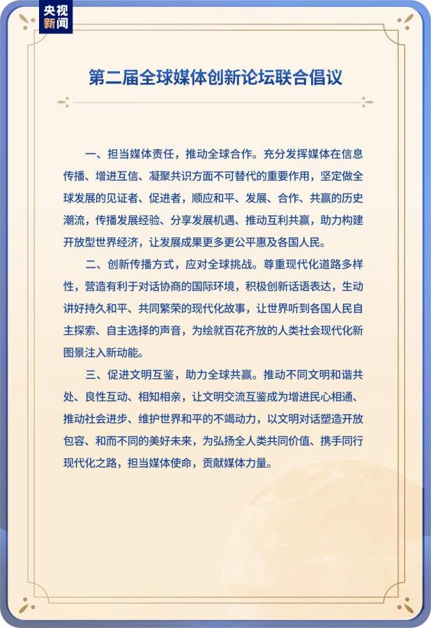 該倡議由中國中央廣播電視總臺(tái)與亞洲—太平洋廣播聯(lián)盟、阿拉伯國家廣播聯(lián)盟、非洲廣播聯(lián)盟、歐洲新聞交換聯(lián)盟、拉美新聞聯(lián)盟等國際媒體組織聯(lián)合發(fā)起,倡導(dǎo)擔(dān)當(dāng)媒體責(zé)任、推動(dòng)全球合作;創(chuàng)新傳播方式、應(yīng)對(duì)全球挑戰(zhàn);促進(jìn)文明互鑒、助力全球共贏。為弘揚(yáng)全人類共同價(jià)值、攜手同行現(xiàn)代化之路,擔(dān)當(dāng)媒體使命,貢獻(xiàn)媒體力量。