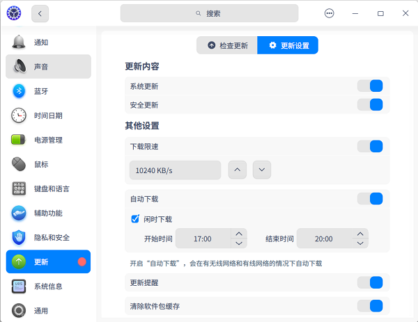 在控制中心-更新-更新設(shè)置模塊,支持自行設(shè)置自動(dòng)下載更新的時(shí)間段以及下載速度。
