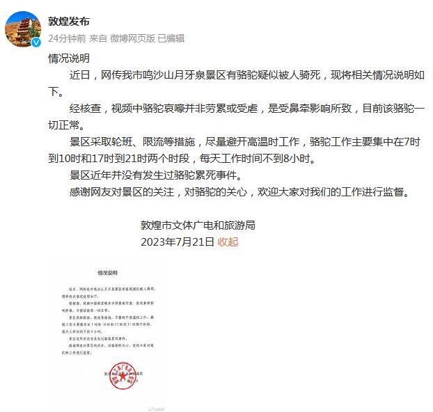 中新網(wǎng)7月21日電 據(jù)甘肅省敦煌市外宣辦官方微博消息,敦煌市文體廣電和旅游局21日發(fā)布情況說明稱,近日,網(wǎng)傳敦煌市鳴沙山月牙泉景區(qū)有駱駝疑似被人騎死。