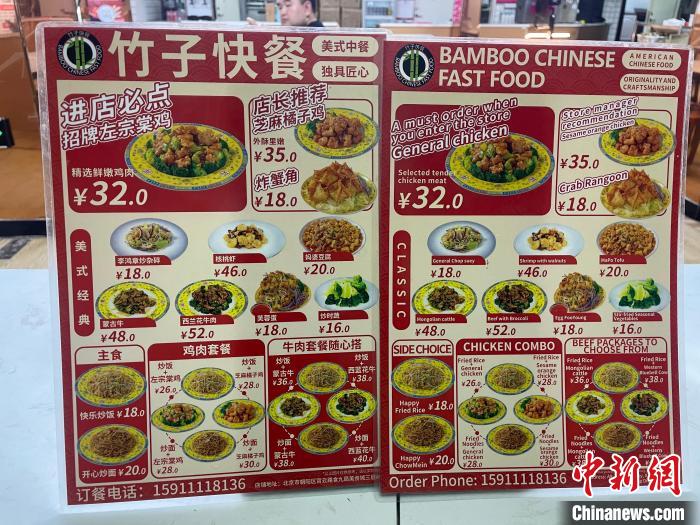 這家名為“竹子快餐”的“美式中餐”檔口,位于北京市朝陽(yáng)區(qū)亮馬橋附近一家美食城內(nèi)。門(mén)口懸掛兩個(gè)紅燈籠,收銀臺(tái)下方擺放兵馬俑雕塑,為食客提供中英雙語(yǔ)菜譜。