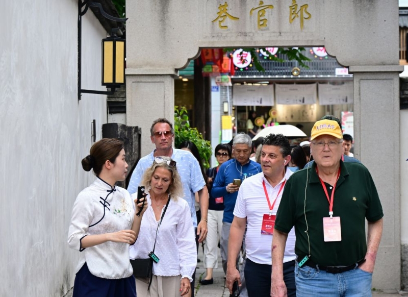 “鼓嶺之友”部分成員和中美各界人士在福州南后街三坊七巷參觀訪問(2023年6月27日攝)。新華社記者 魏培全 攝