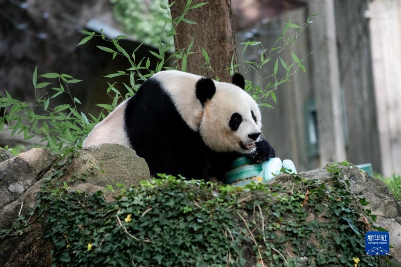 7月22日,在美國華盛頓史密森學(xué)會國家動物園,大熊貓“美香”享用生日蛋糕。新華社發(fā)(史密森學(xué)會國家動物園供圖)