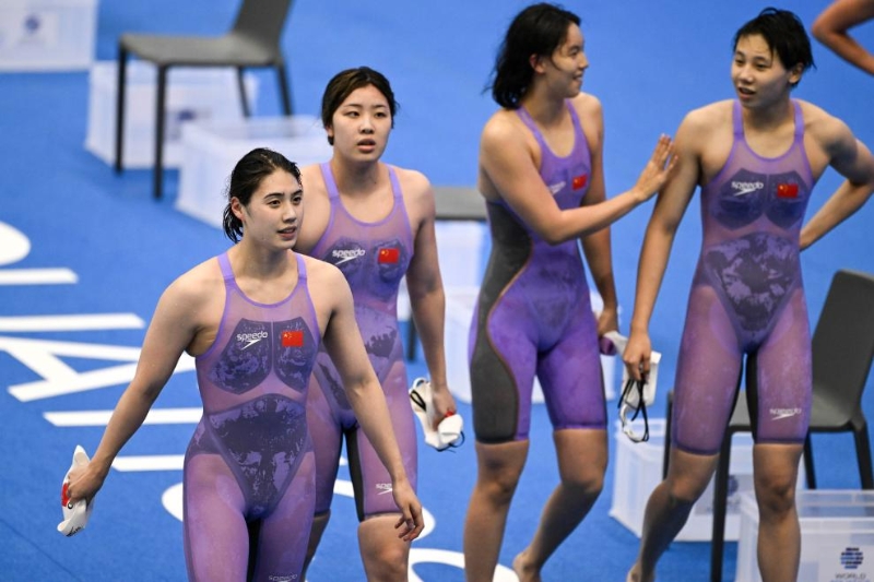 7月23日,中國隊選手張雨霏(左一)、吳卿風(fēng)(左二)、楊?,u(右二)、程玉潔(右一)在決賽后。新華社記者 許暢 攝