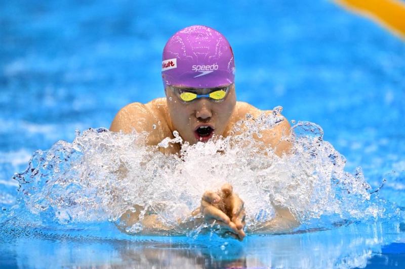 7月23日,中國選手覃海洋在男子100米蛙泳半決賽中。新華社記者 張笑宇 攝