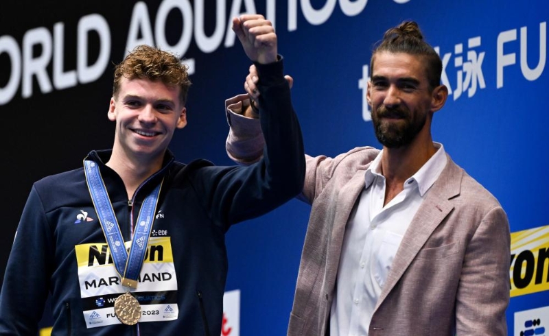 7月23日,法國選手馬爾尚 (左)和美國名將菲爾普斯在頒獎儀式上合影留念。新華社記者 夏一方 攝
