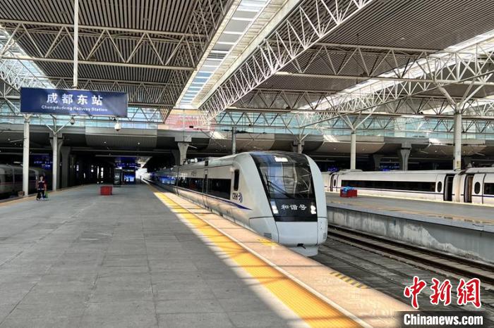 試驗(yàn)動車組正從成都東站駛出。成蘭鐵路公司供圖