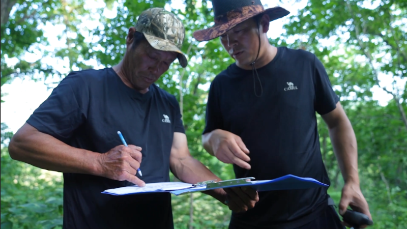 東北虎豹國家公園社區(qū)共管巡護隊隊員進行記錄。新華社記者 司曉帥 攝