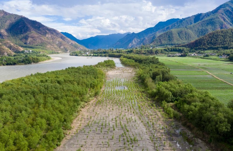 這是2023年6月20日在云南麗江市石鼓鎮(zhèn)拍攝的金沙江邊的柳林,中間部分為新栽種的柳樹(無人機照片)。新華社記者陳欣波 攝